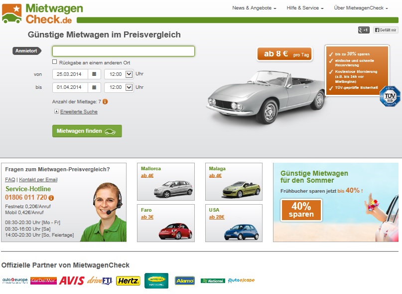 MietwagenCheck ist ein Vergleichs-Portal der HolidayCheck AG. Nun möchte die HolidayCheck AG Ihren Service auch im Rent-a-Car Geschäft anbieten und stellt seine neue Mietwagenplattform MietwagenCheck vor. Es werden Euch günstige Mietwägen und Leihwägen in einem Preisvergleich namhafter Autovermieter angeboten. Ob Autovermietung in Deutschland, auf den beliebtesten Inseln im Mittelmeer, international – europaweit oder in außereuropäischen Ländern – mit MietwagenCheck erzielt Ihr stets den bestmöglichen Preis, egal an welchem Ort auf dieser Welt.