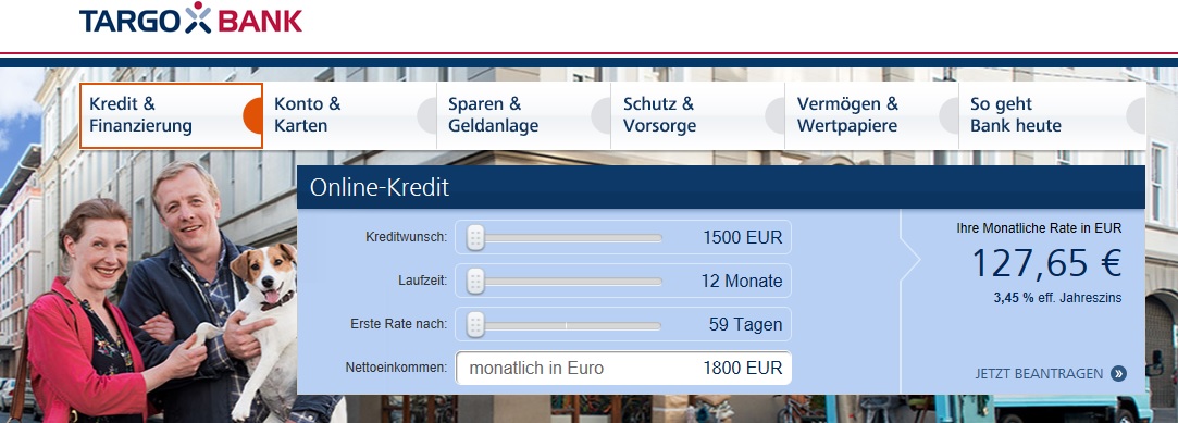 „TARGOBANK – so geht Bank heute!“ Wer kennt diesen Spruch nicht und wahrlich, die TARGOBANK bietet einen „wie für mich gemacht Kredit“ bereits ab 1.500,- € Kreditsumme und 3,45% effektivem Jahreszins an – sagenhaft ! Anhand eines Beispiels wollen wir Euch dieses fantastische Angebot einmal näher bringen: Ihr habt ein monatliches Nettoeinkommen von 1.800,- € und benötigt für Eure Urlaubsreise einen Kredit von 1.500,- €. Ihr wollt diesen Kredit innerhalb von 12 Monaten abgezahlt haben – daher müsst Ihr an die TARGOBANK nur 127,65 € monatlich zurückzahlen. Die erste Ratenzahlung wäre dann nach 59 Tagen (bis 89 Tage erweiterbar) zu leisten. Rein rechnerisch kostet Euch dieser „wie für mich gemacht Kredit“ nur 31,80 € !!