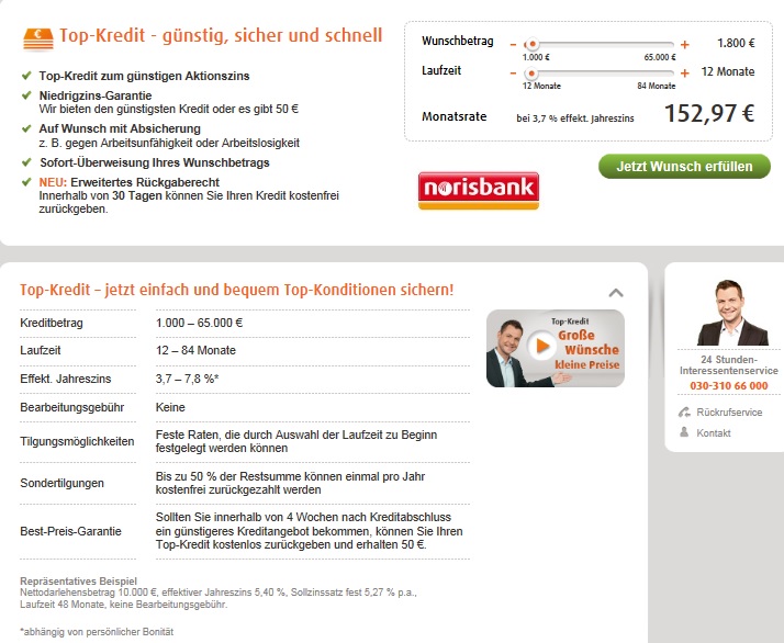Die norisbank bietet einen top Kredit (ab 1.000,- €) mit einem Top-Zinssatz von nur 3,7% effektivem Jahreszins an, den Ihr für z.B. Eure nächste Urlaubsreise nutzen könnt. So lässt sich zum Beispiel ein Reisekredit in Höhe von 1.800,- € in 12 bequemen Monatsraten a 152,97 € finanzieren und damit der Traumurlaub innerhalb eines Jahres erfüllen. Und das tolle daran ist, dass Euch der Kredit von der norisbank am Ende der Laufzeit von 1 Jahr weniger als 36,- € gekostet hat.